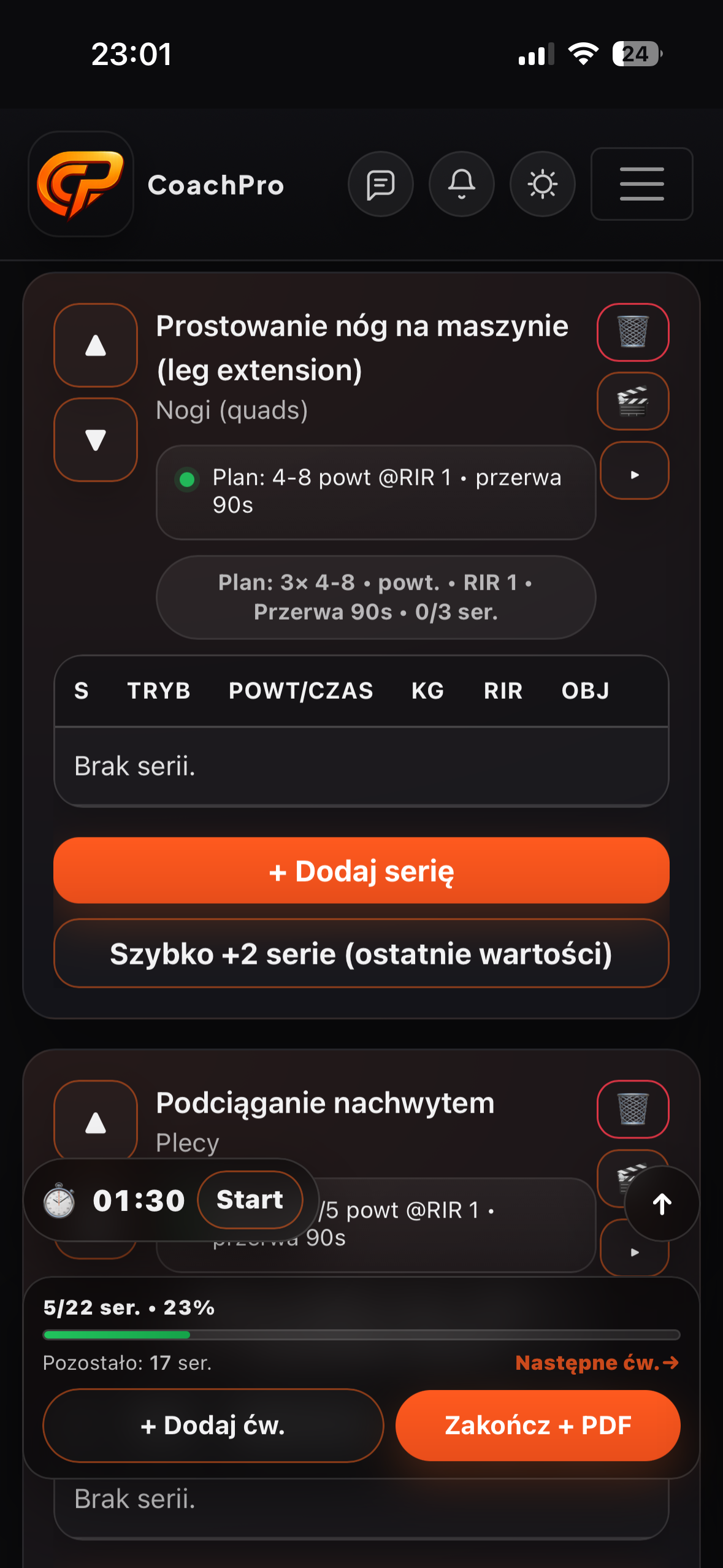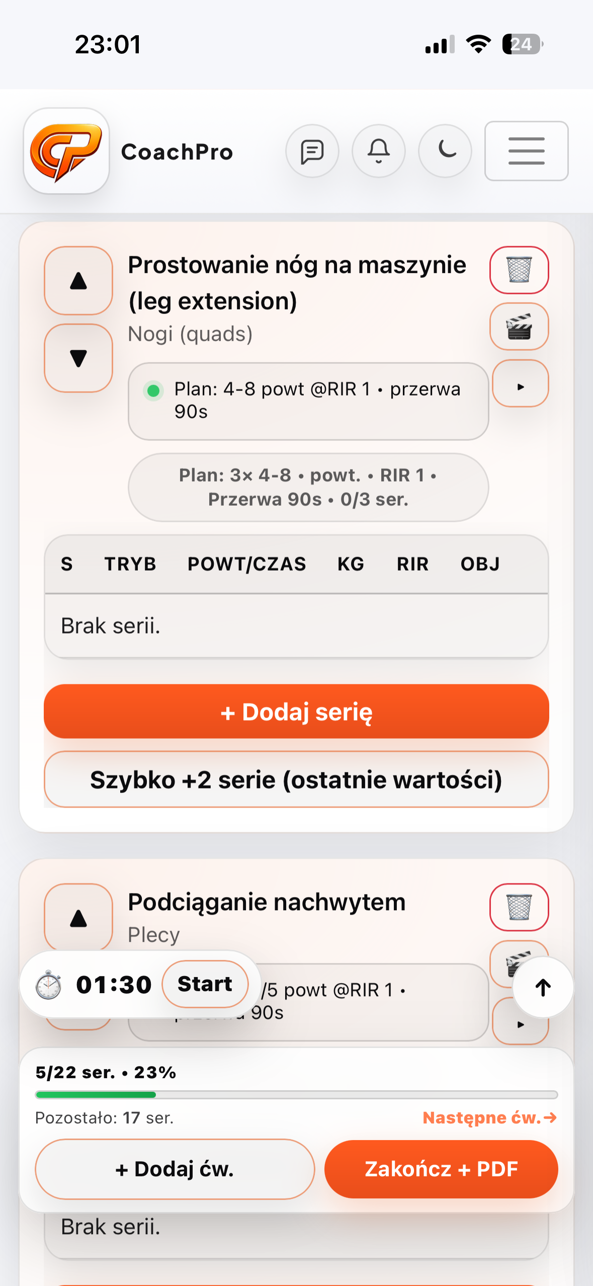 W trakcie sesji wpisujesz ciężar/powtórzenia/RIR. Po zakończeniu generujesz raport PDF jednym kliknięciem.