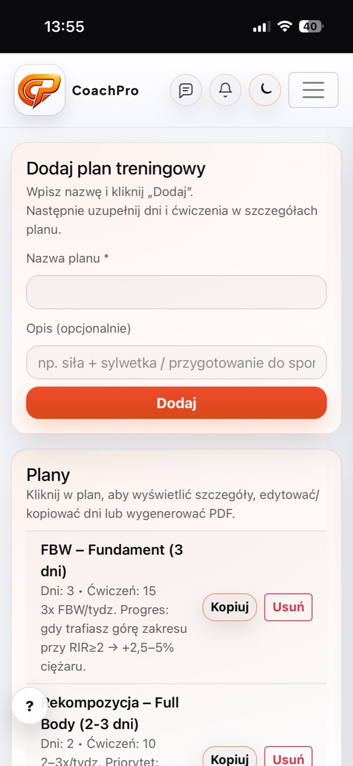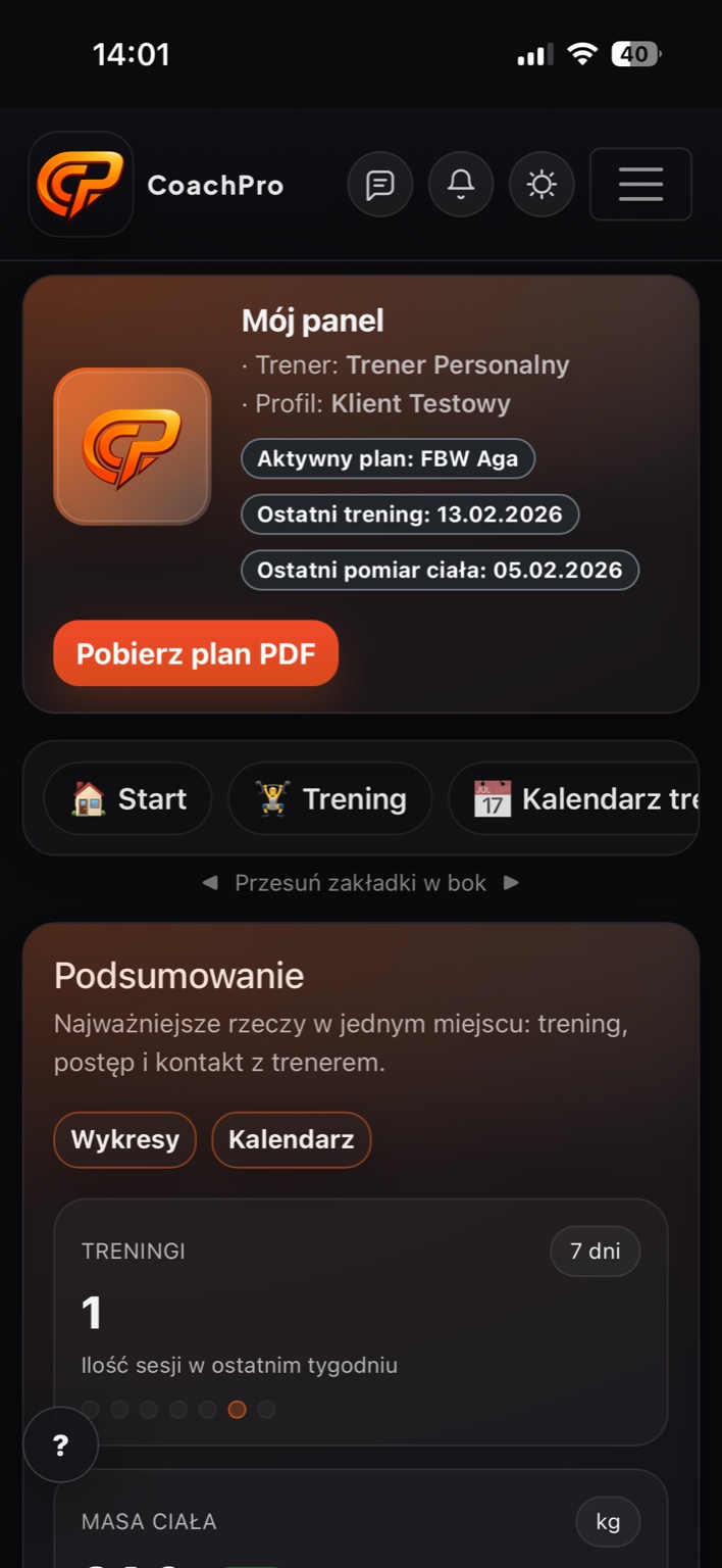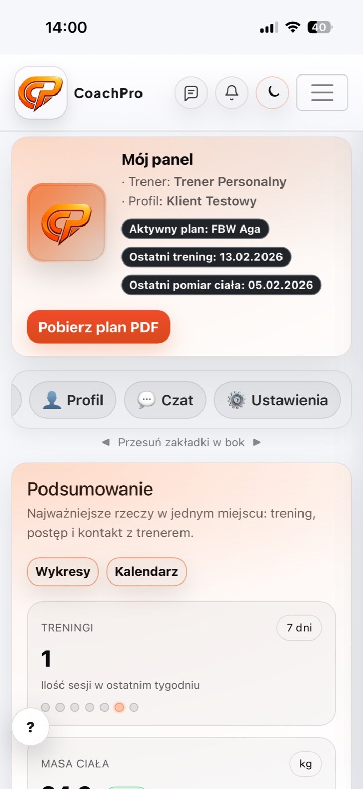 CoachPro automatyzuje Twoją pracę i daje klientowi pełen wgląd w proces, plan i postępy - bez szukania w notatkach i kilku aplikacjach.