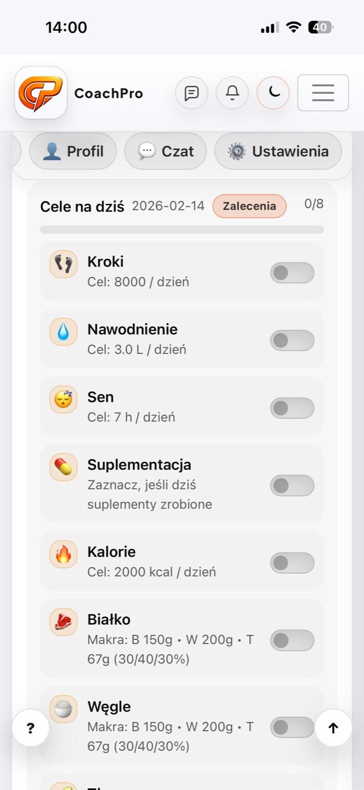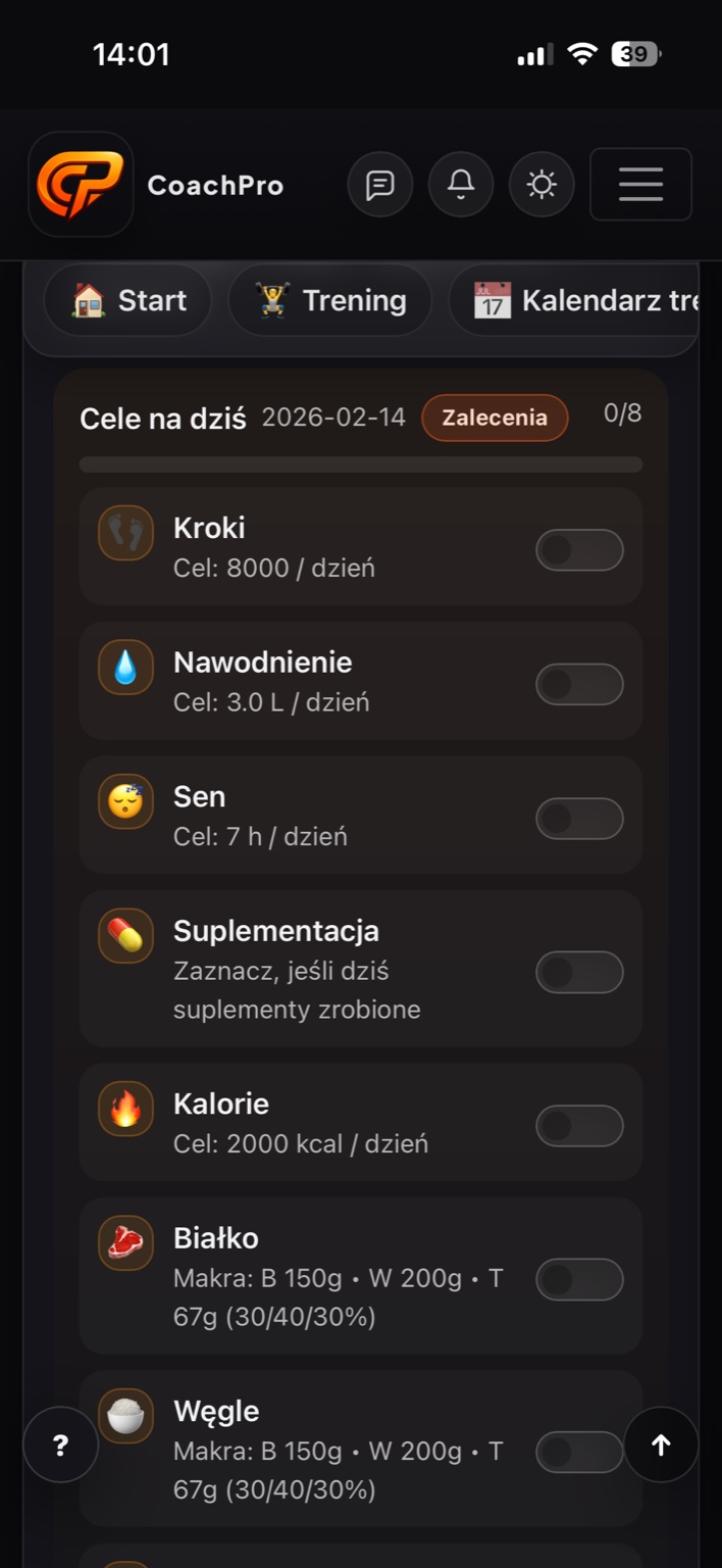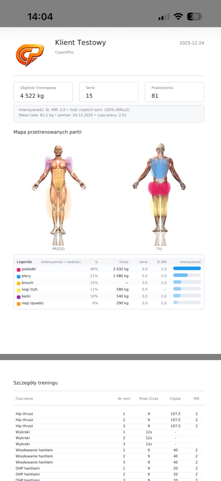 CoachPro automatyzuje Twoją pracę i daje klientowi pełen wgląd w proces, plan i postępy - bez szukania w notatkach i kilku aplikacjach.