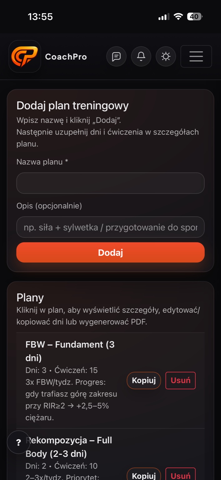 Inne narzędzia często skupiają się tylko na planie. CoachPro zostało stworzone przez specjalistów łączy trening, progres, raporty PDF, prowadzenie 24/7 i pracę zespołu w studio - w jednym systemie.